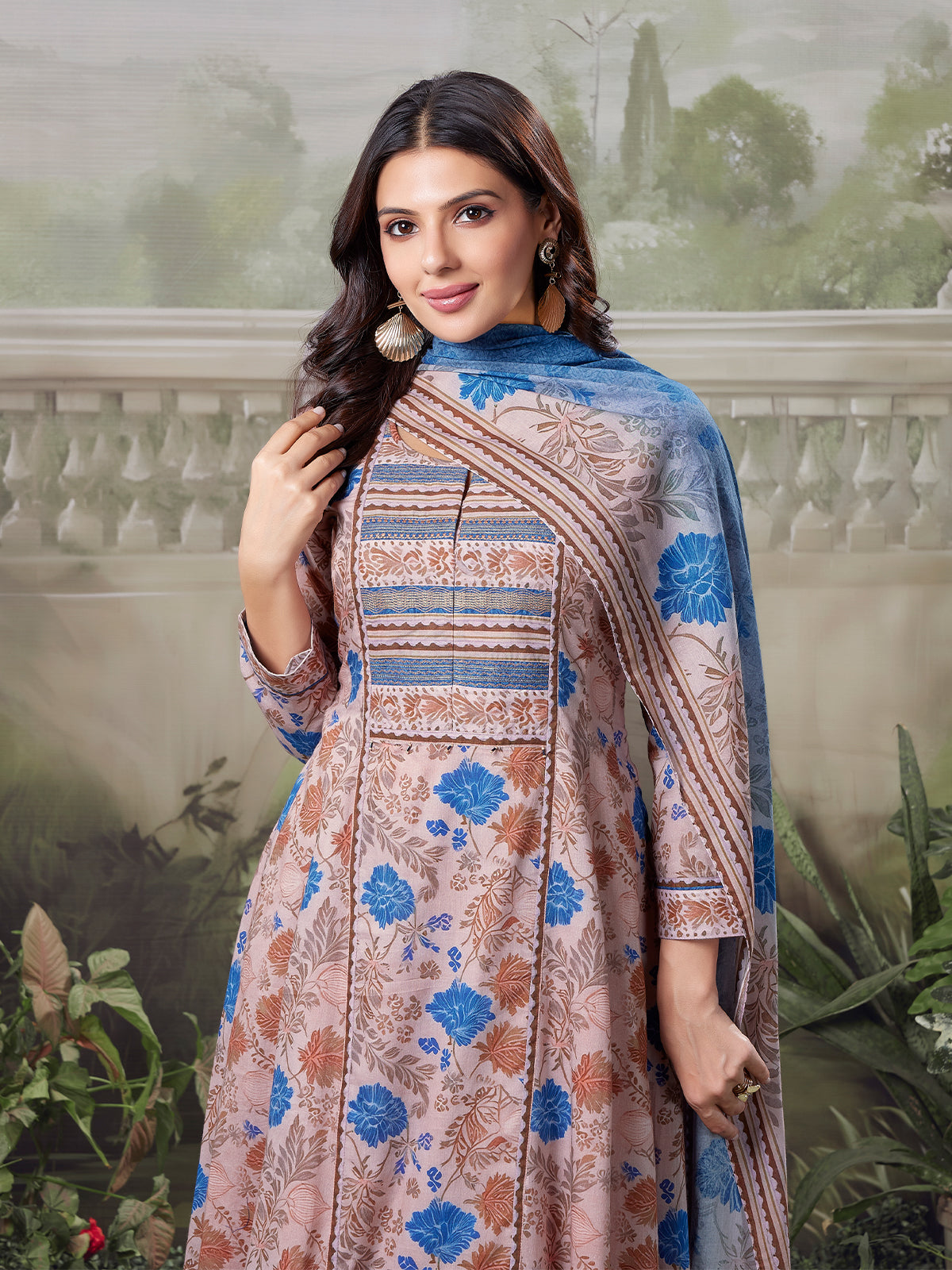 Crafted from pure cotton fabric, this Anarkali flows with an easy, breathable elegance suited for Indian summers. Set against a warm blush-beige base, the silhouette is adorned with all-over floral prints in earthy rust and deep indigo blue, creating a soft yet striking contrast. The yoke features intricate panelled detailing and delicate pattern play, adding refined structure to the bodice. A soft cotton lining ensures comfort, while solid blush-beige straight-fit pants lend balance and quiet sophistication to the look. Finished with a coordinated dupatta, this Anarkali suit for women feels feminine, graceful, and timelessly elegant.