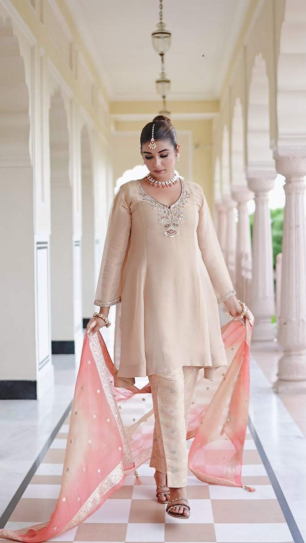 For a serene wedding brunch, a beige tissue silk kurta with a gentle flare and delicate zardosi embroidery around the neckline captures understated elegance. Jacquard woven pants add texture and refinement, while the organza jacquard dupatta in soft beige and orange flows gracefully, catching the light with effortless charm. Radiant and poised, the ensemble exudes a sophisticated festive aura. An exquisite display of Indian wear craftsmanship, where luxurious fabrics and refined details define modern ethnic elegance.