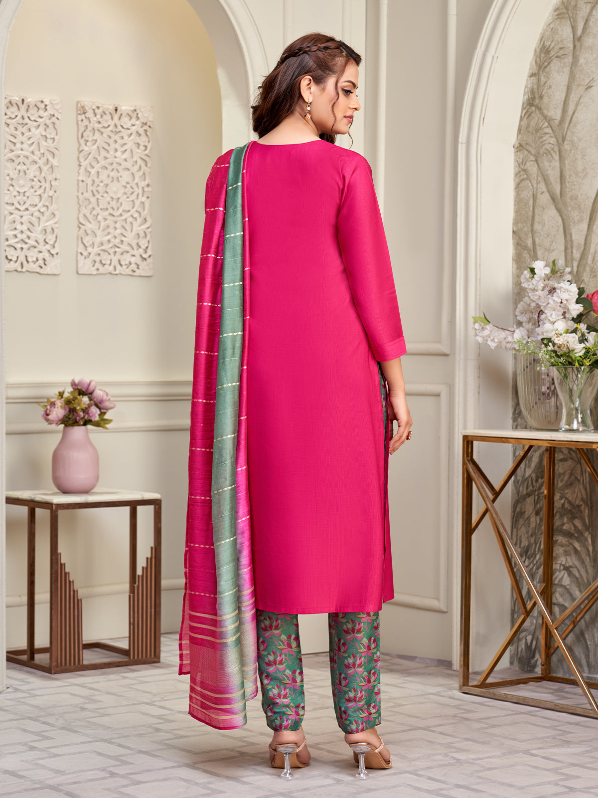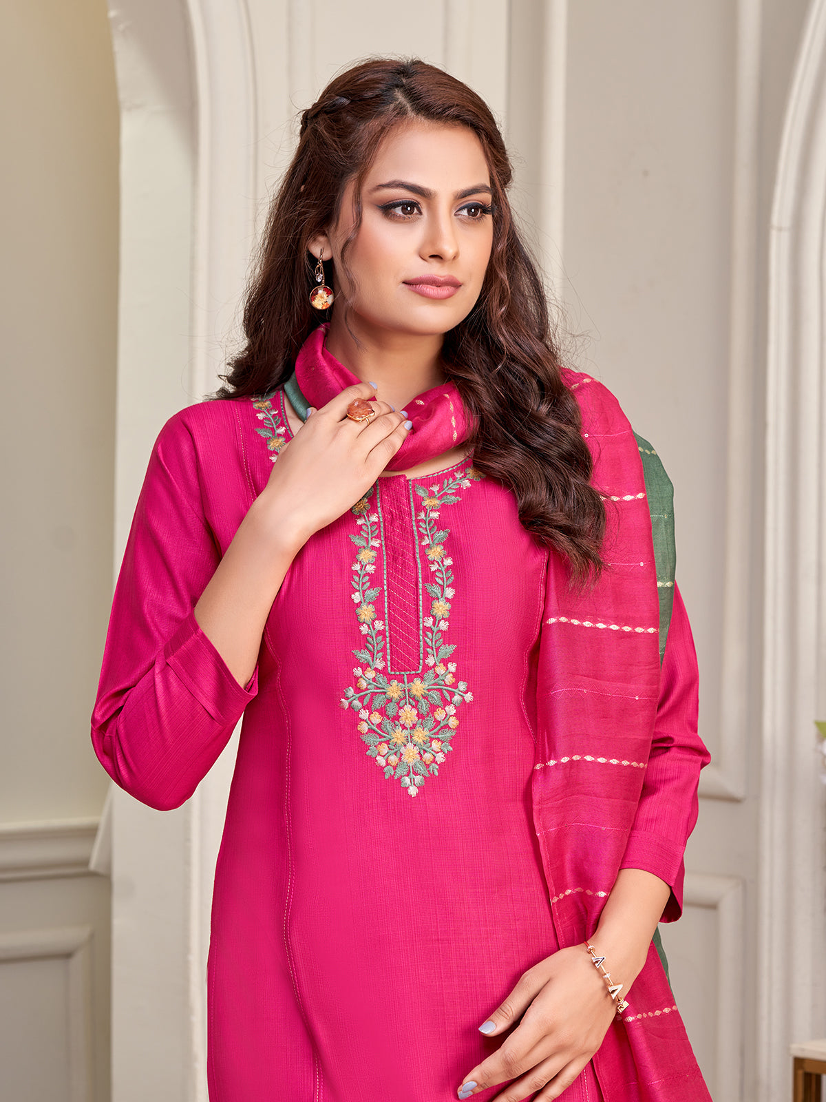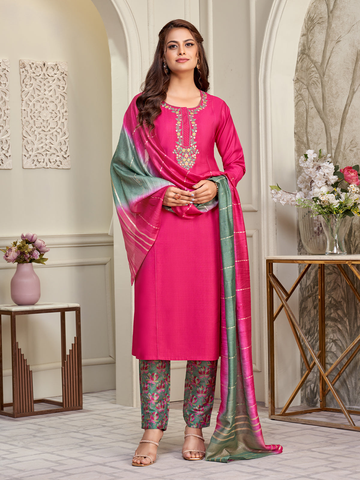 At work, she lets her style speak with a bright pink straight-fit kurta in breezy viscose, its colorful floral embroidered yoke adding a lively touch of artistry. The green floral print pants lend a refreshing contrast, while the zari-woven shaded dupatta drapes gracefully, blending tradition with everyday elegance. A perfect balance of vibrant hues and refined Indian wear, her look mirrors confidence and charm through every meeting.