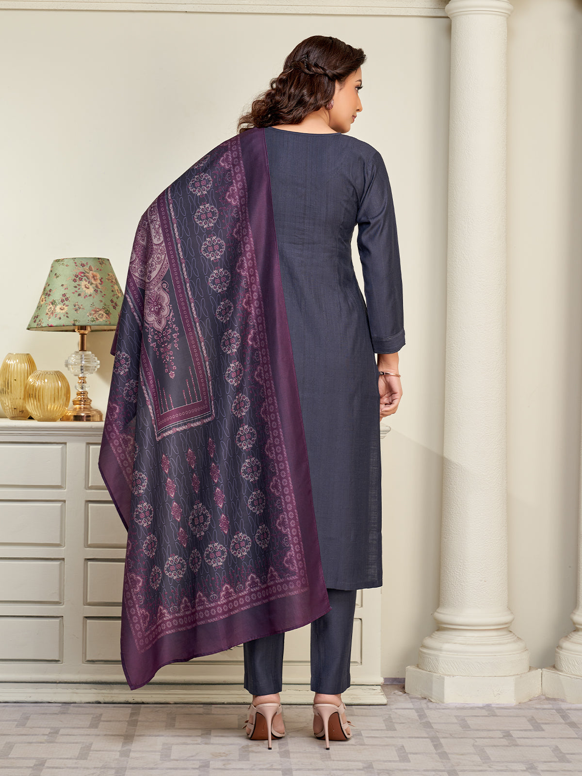 A deep blue viscose kurta with an embroidered yoke and delicate floral motifs sets the tone for her evening elegance. Paired with co-ordinated blue pants and a purple-blue printed dupatta that drapes in fluid grace, the ensemble radiates sophistication and charm. Perfect for an intimate evening occasion, it blends subtle artistry with timeless style.