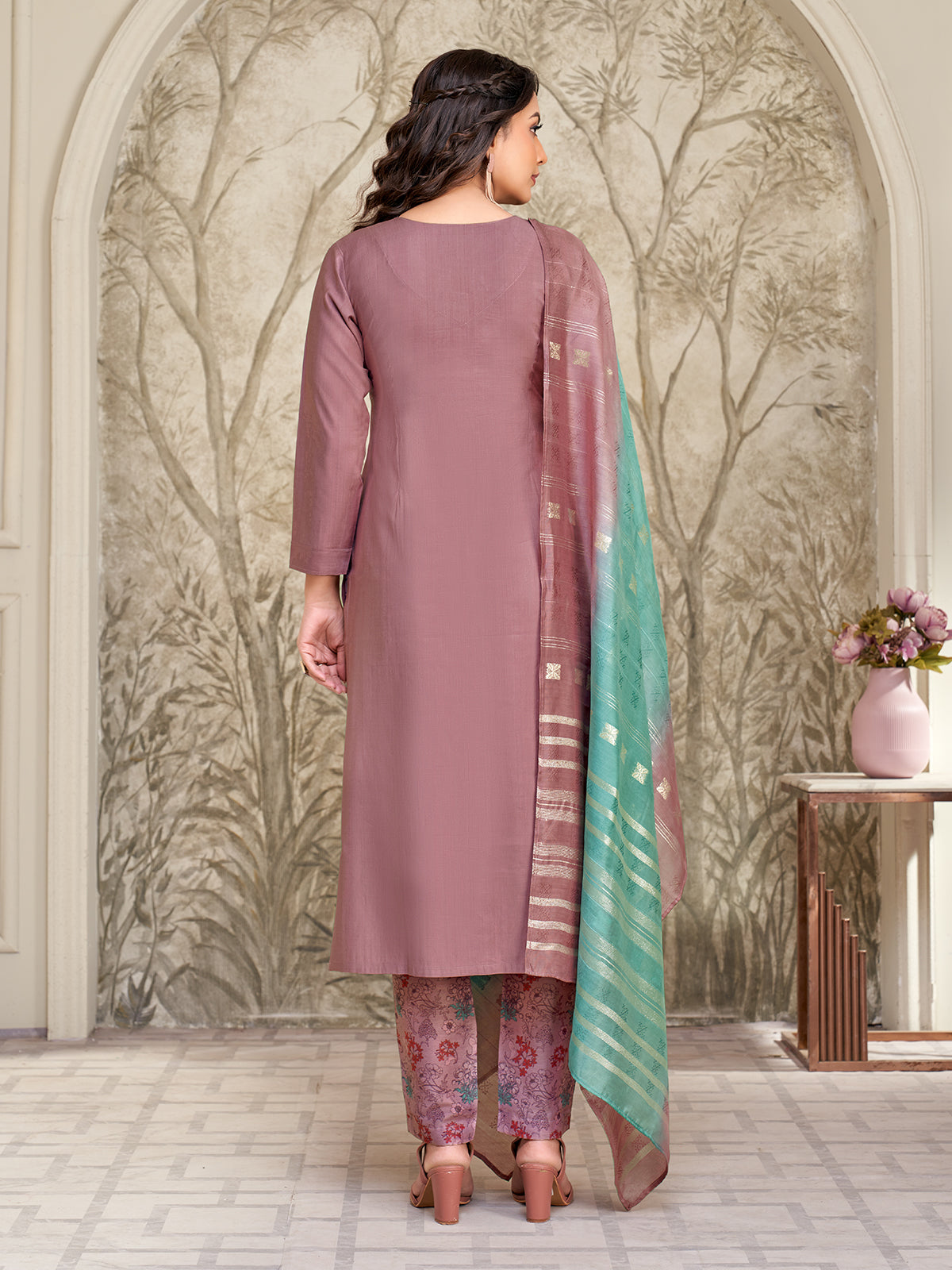 A dusty pink straight-fit kurta with a delicately embroidered yoke and floral motifs makes for an effortlessly elegant evening choice. Styled with floral-printed pink pants and a zari-woven shaded dupatta that glimmers softly under the lights, the look is both graceful and festive. Perfectly poised, it reflects timeless femininity with a modern flair.