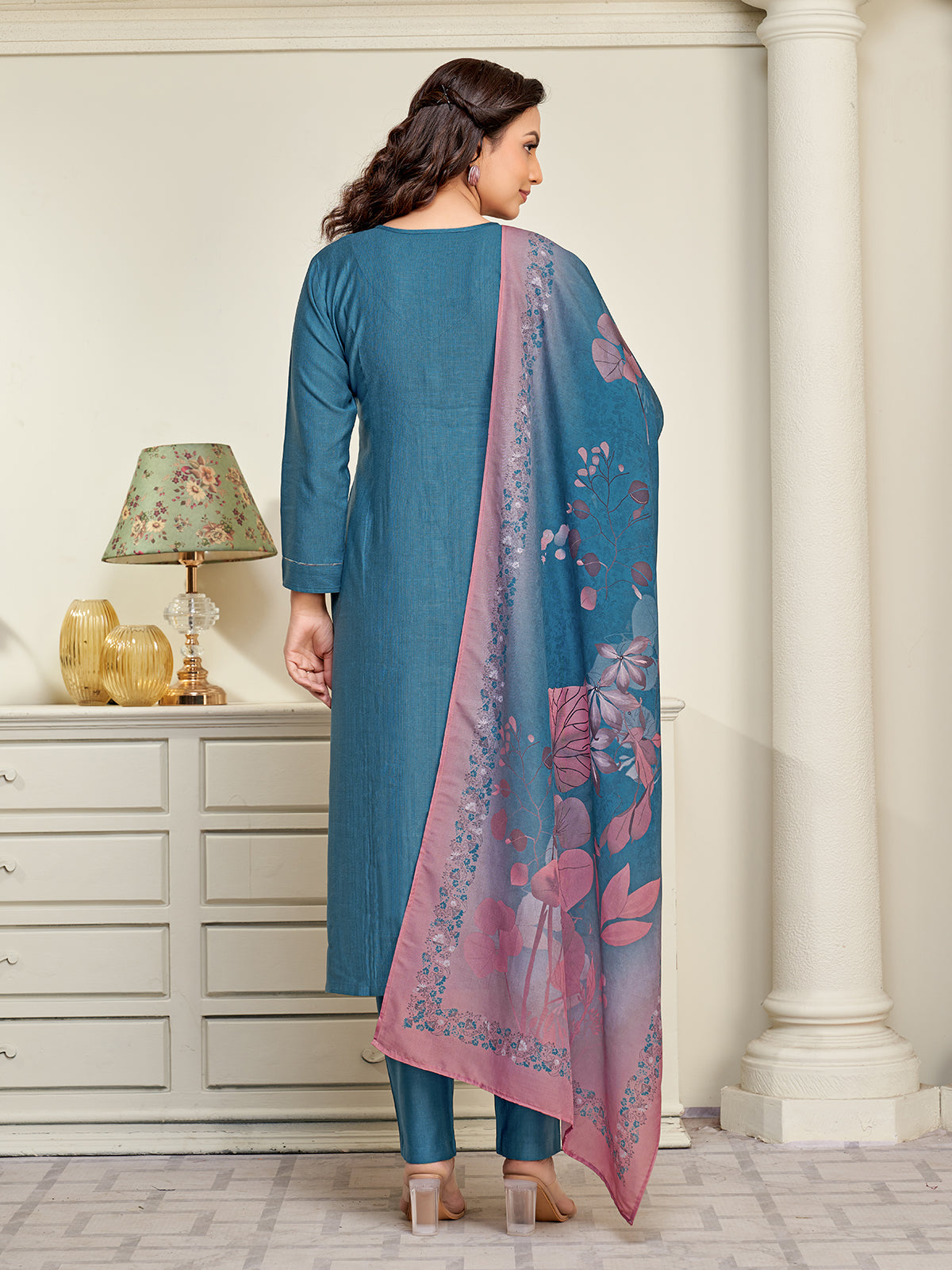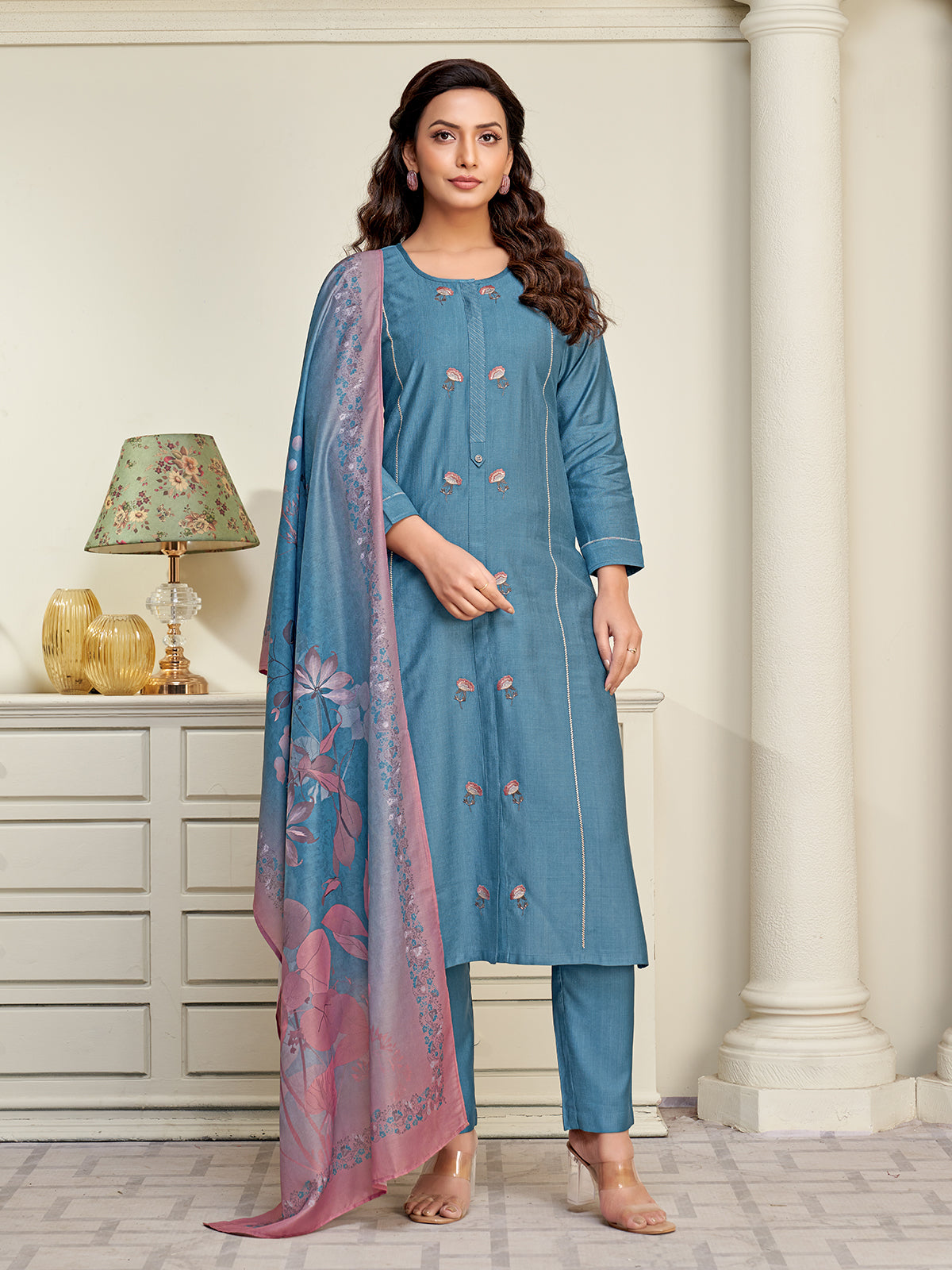 In a dusty blue viscose straight-fit kurta with delicate floral embroidery, the look is refined yet refreshing for the workplace. Teamed with co-ordinated pink pants and a shaded floral-print dupatta, it strikes the right balance of graceful elegance and office-ready sophistication.