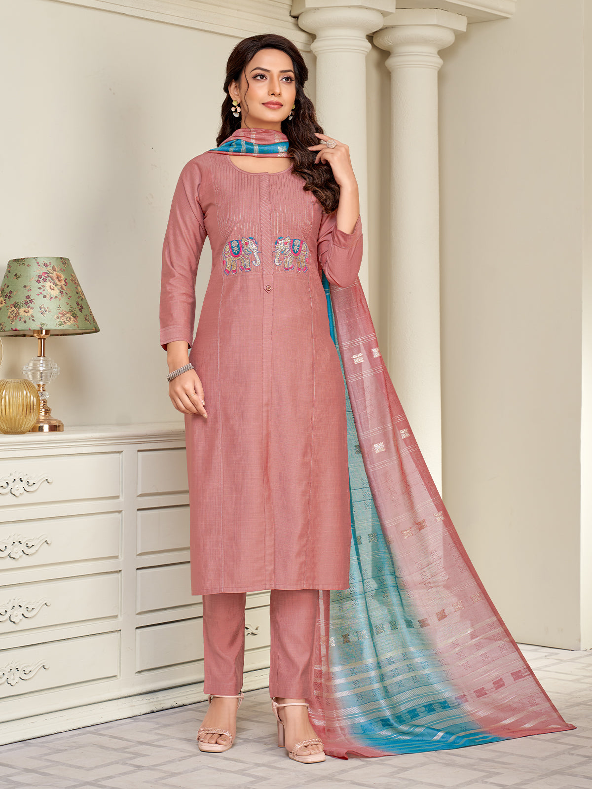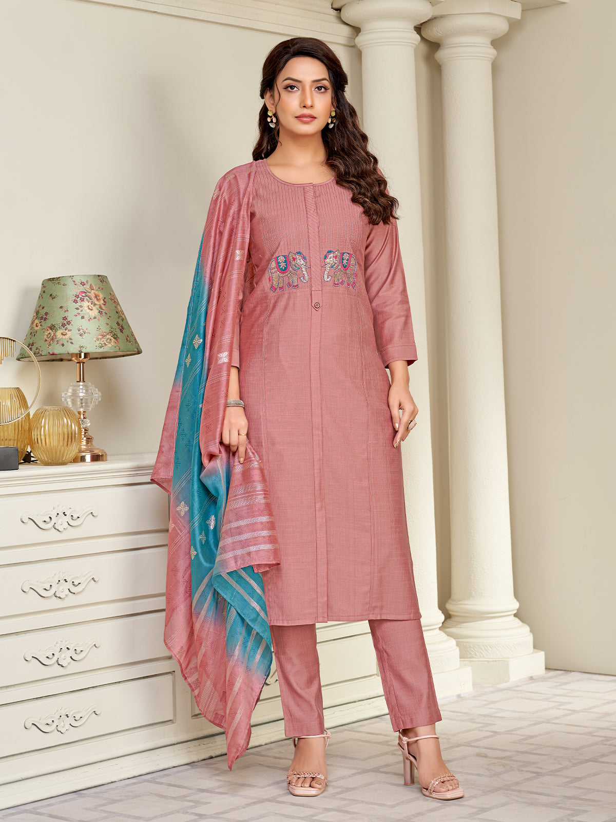 In a dusty pink viscose straight-fit kurta, the zari stripe embroidery on the yoke and an intricately embroidered elephant motif add a touch of regal artistry. Paired with co-ordinated pink pants and a zari-woven shaded dupatta that shimmers with grace, the ensemble embodies festive elegance and refined charm—perfect for an enchanting evening occasion.