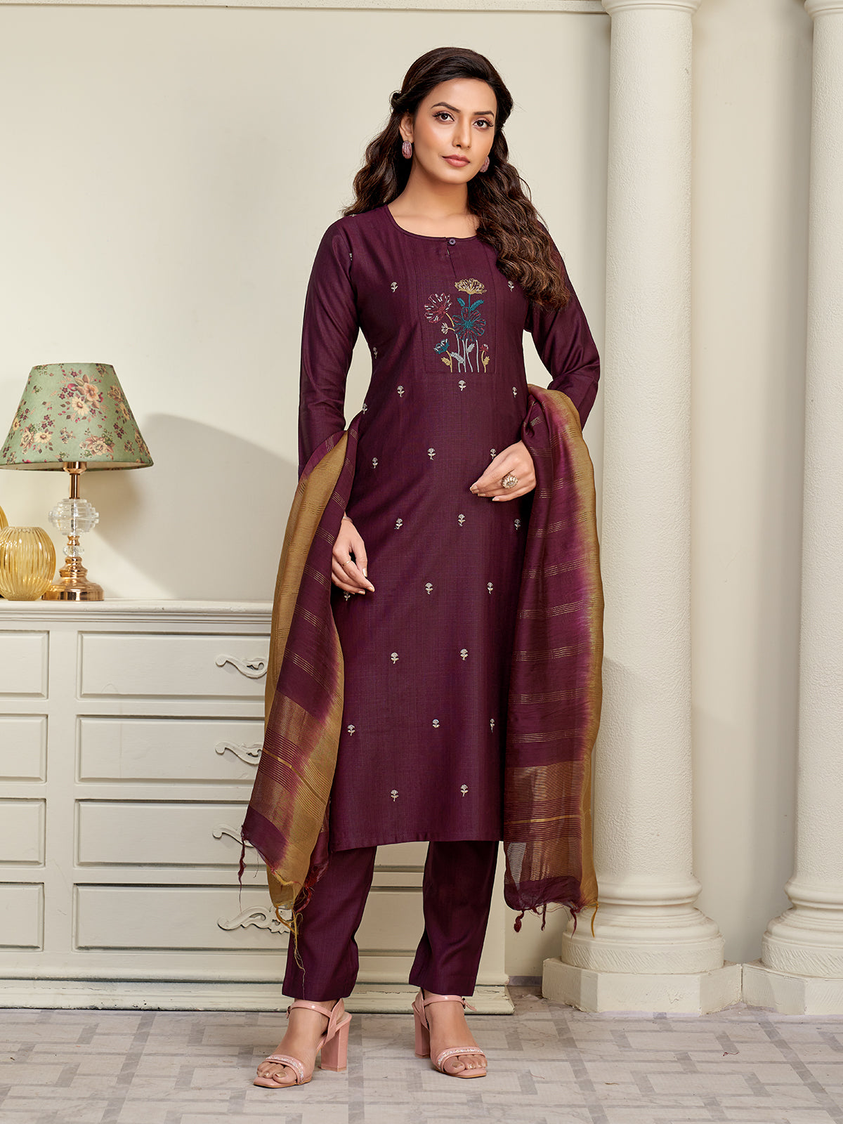 As twilight sets in, she steps into the evening draped in a wine viscose straight-fit kurta, its delicate floral embroidery on the yoke and zari-kissed motifs glistening softly under the lights. Paired with co-ordinated wine pants and a zari-woven shaded dupatta that flows with understated grace, her look is both elegant and contemporary. With minimal gold jewelry, sleek heels, and a touch of kohl, she embodies effortless sophistication—perfectly dressed for an intimate dinner soirée.