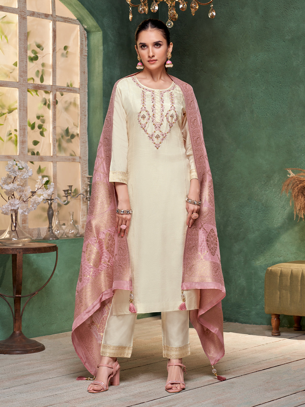 Delicate and graceful, this ivory semi silk suit set evokes an aura of refined celebration. The straight-fit kurta, crafted from lustrous semi silk, is adorned with intricate zardosi and resham embroidery in soft rose gold tones that lend a touch of feminine charm. Paired with ivory semi silk pants detailed with embroidered hems, the ensemble is beautifully complemented by a rose pink jacquard woven dupatta enriched with floral zari motifs and an ornate gold border. A perfect blend of elegance, tradition, and contemporary poise, this look is ideal for festive brunches, intimate celebrations, and elegant soirées.