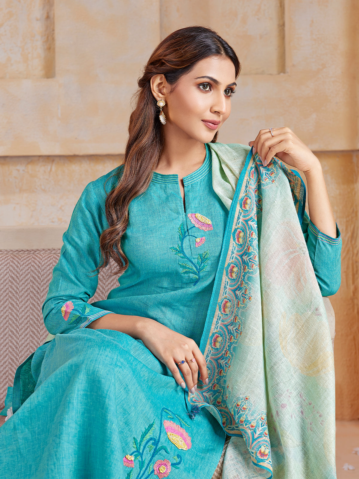 At an intimate evening soiree, she steps in wearing a blue linen suit set that carries a serene yet striking elegance. The straight-fit kurta, adorned with stunning floral woollen thread embroidery across the front and sleeves, blends feminine charm with classic Indian wear artistry. Co-ordinated linen pants give the ensemble a polished, modern balance, while the floral-printed dupatta adds a soft, graceful flourish.