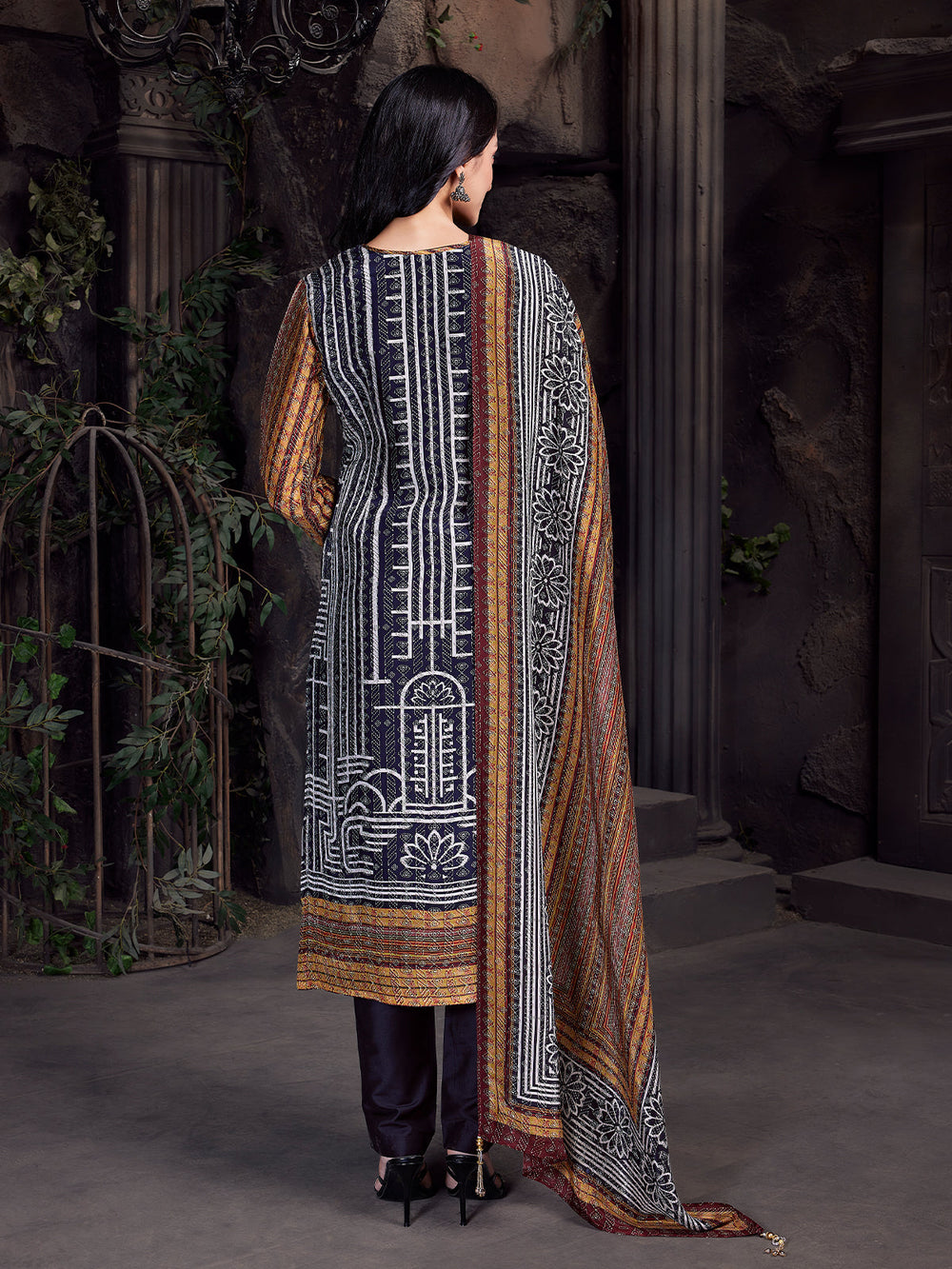 She enters the festive night draped in the fluid charm of crepe silk, her straight-fit kurta adorned with architectural-inspired black and white motifs. The yoke shimmers with delicate zardozi embroidery, framed by warm earthy tones of rust, mustard and red. A striped printed dupatta, flowing gracefully over her shoulders, adds richness and depth, while sleek black pants ground the look with elegance. A beautiful expression of ethnic wear, this ensemble blends bold prints, refined colors, and timeless festive style.