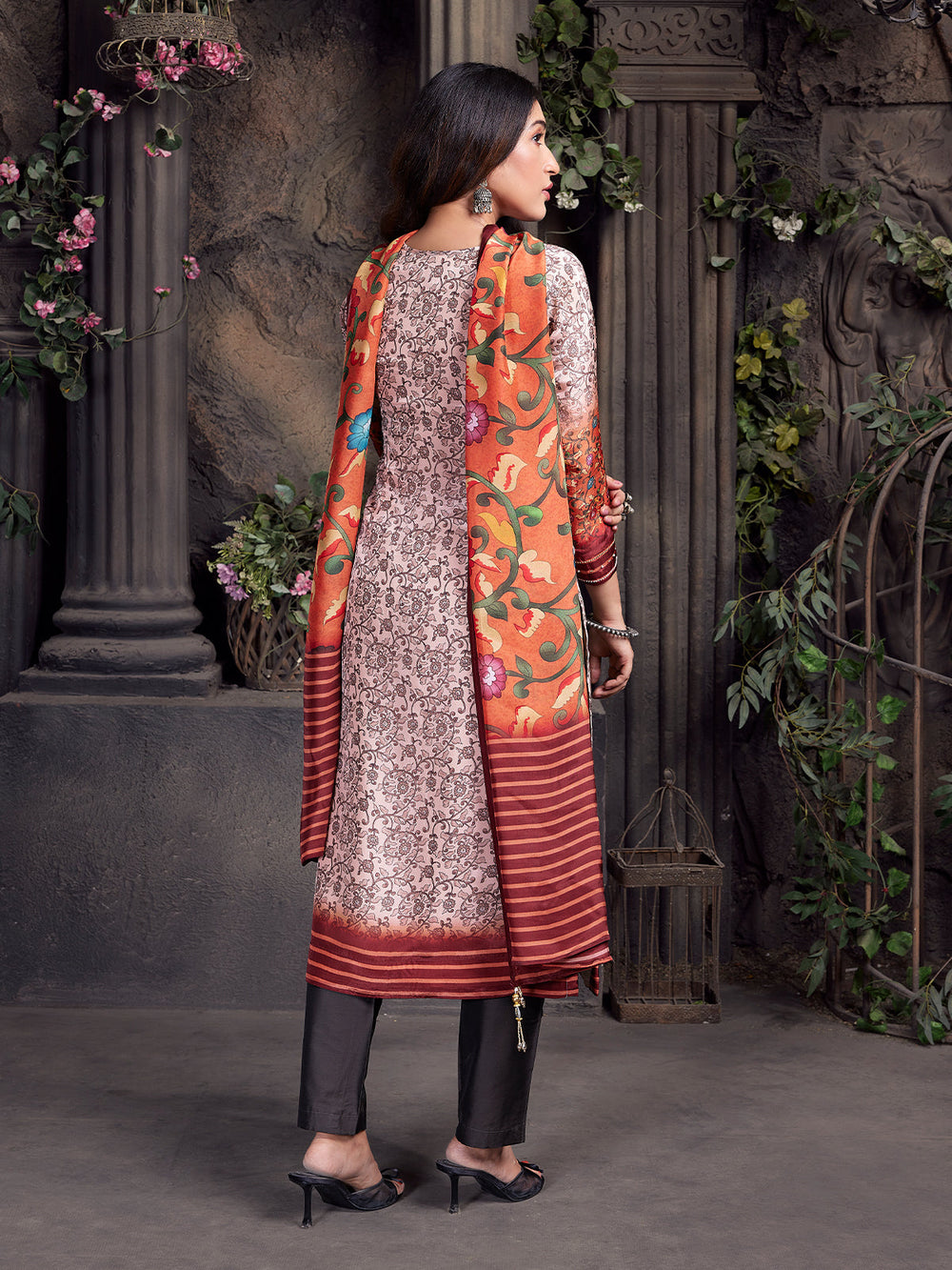 She walked into the festive gathering with quiet elegance, her blush crepe silk kurta blooming with delicate floral prints. The deep rust-red yoke, highlighted with zardozi embroidery, added regal depth, while sleek black pants kept the look refined. Draped gracefully across her shoulders, the bold rust dupatta, adorned with painterly florals and striped edges, flowed like a canvas of tradition and artistry. A perfect blend of Indian ethnic wear and timeless festive fashion.