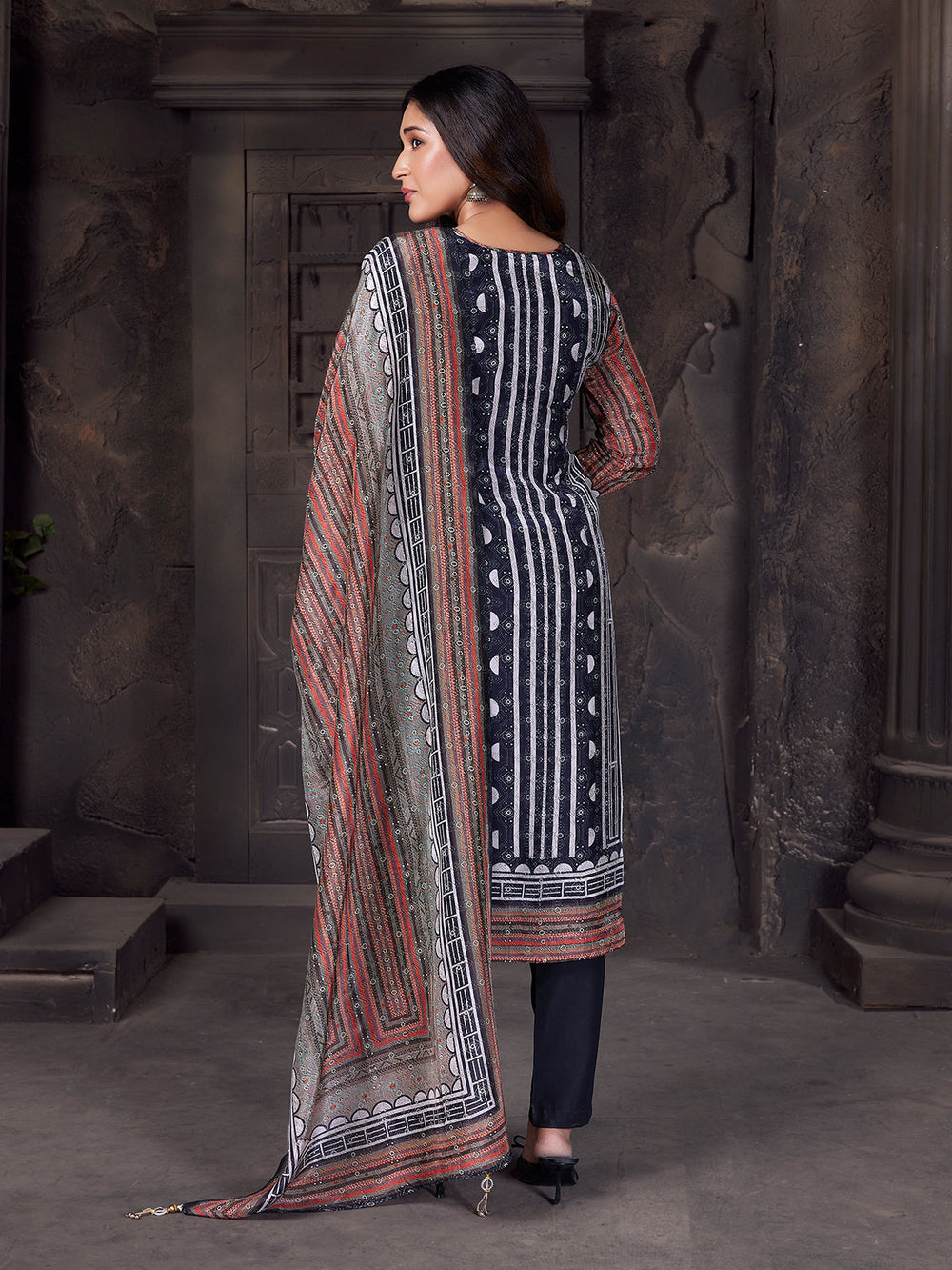 For a festive gathering steeped in tradition, she steps into timeless elegance with a straight-fit Crepe Silk kurta adorned in midnight black with intricate floral and linear prints in ivory muted gold. The neckline is elevated with a panel of ethnic-inspired motifs, adding a touch of regal detailing to the ensemble. Draped gracefully, the printed dupatta in rust, black, and ivory tones flows with sophistication, completing her look with effortless grandeur. Paired with classic black trousers, this Indian wear suit set becomes the perfect blend of tradition & festive charm.