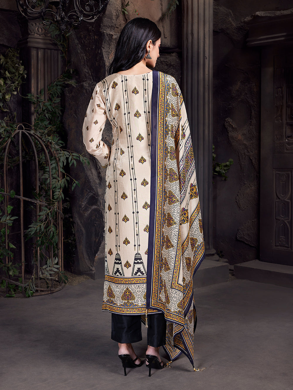 In the golden warmth of a wedding brunch, an ivory crepe silk suit set becomes a canvas of understated grandeur. Adorned with intricate paisley and floral motifs in muted mustard, deep maroon and hints of black, it carries the richness of heritage with a modern spirit. The zardosi-embroidered yoke glimmers with delicate artistry, lending a regal finish to the straight silhouette. Paired with sleek black pants and a beautifully printed dupatta edged with ornate borders and stylized motifs, the ensemble drapes with effortless grace. A celebration of Indian ethnic wear at its finest..