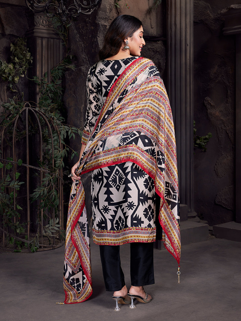 She walks into the festive evening with quiet confidence, draped in the sheen of crepe silk. The straight-fit kurta, uplifted with a zardozi-embroidered yoke and bold black-and-ivory geometric patterns, reflects a striking play of tradition and modernity. Accented with ikat-inspired borders and paired with a printed dupatta in warm tones of red and mustard, her look is a beautiful take on contemporary Indian wear. Paired with classic black pants, this ensemble is festive fashion at its most elegant and effortless.