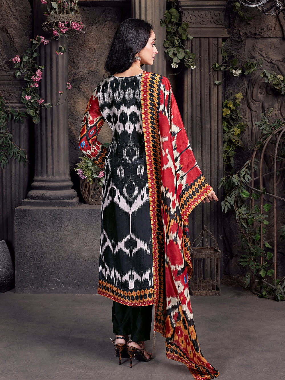 She arrives at the celebratory dinner draped in the luxurious sheen of crepe silk, her black straight-fit kurta brought to life with a zardosi embroidered yoke that glimmers with regal artistry & white ikat-inspired print lends a bold yet contemporary edge. Seamlessly paired with sleek black pants for timeless sophistication & A vibrant red dupatta, patterned with striking yellow gold and black ikat print, cascades elegantly over her shoulders, adding festive grandeur to her look. In this moment, she is the perfect harmony of traditional Indian elegance and modern style—beautiful, confident, and effortlessly royal.