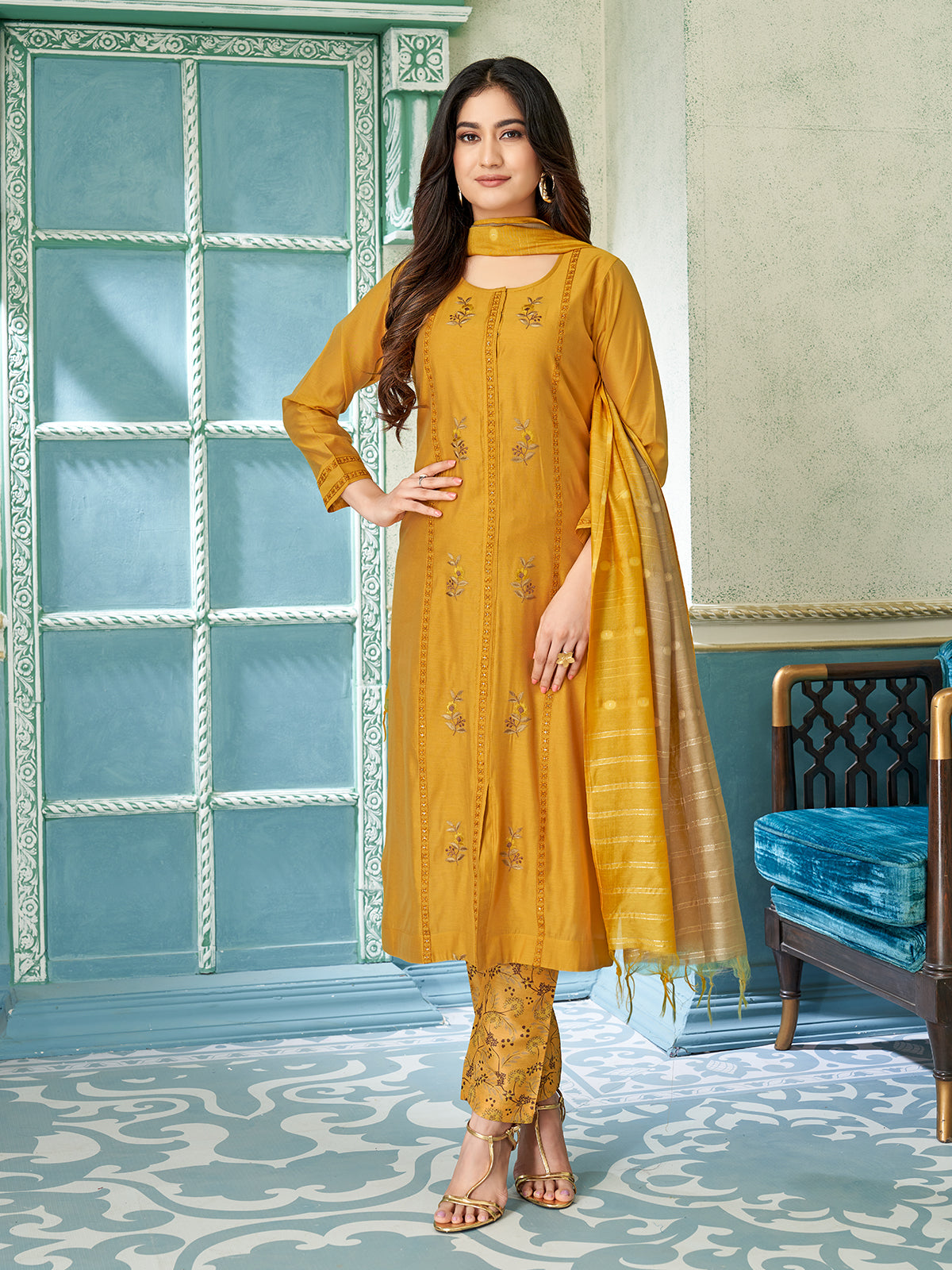 She walks into the office in a light pink viscose straight-fit suit set, its delicate multicolor geometric embroidery adding a subtle pop of vibrance to her look. Paired with crisp co-ordinated light pink pants and a light floral-printed dupatta draped neatly over her shoulder, she exudes a balance of professional elegance and contemporary charm. Effortless, refined, and work-ready—her style speaks confidence with every step.