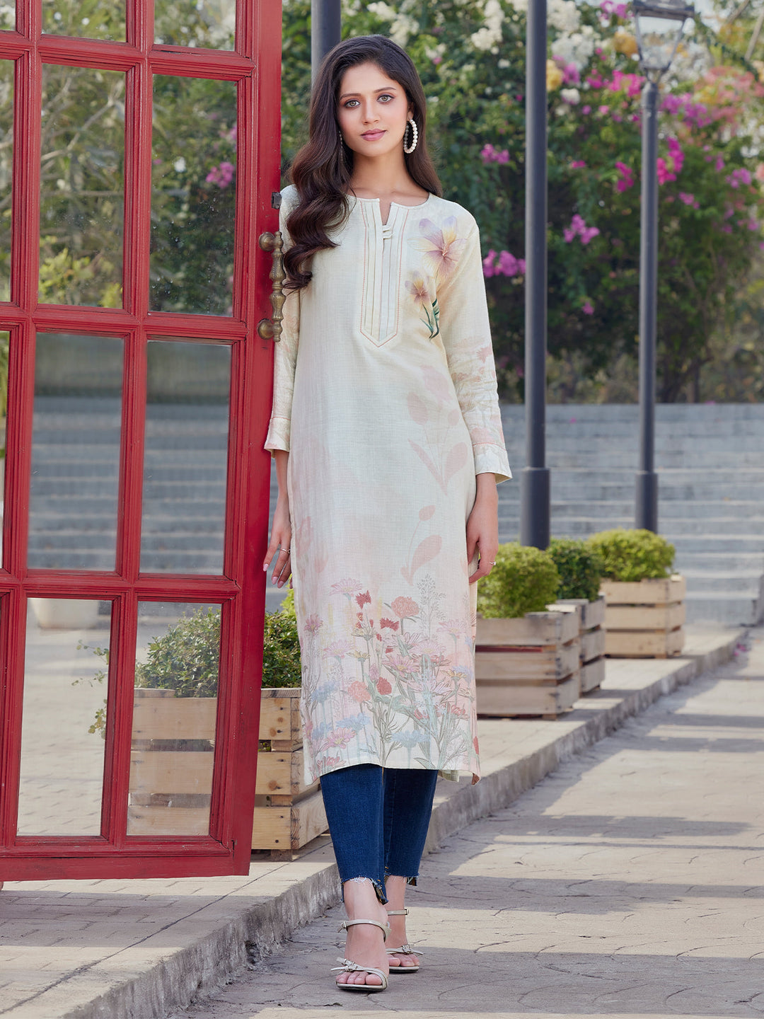 Soft Ivory Floral Print Cotton Kurti