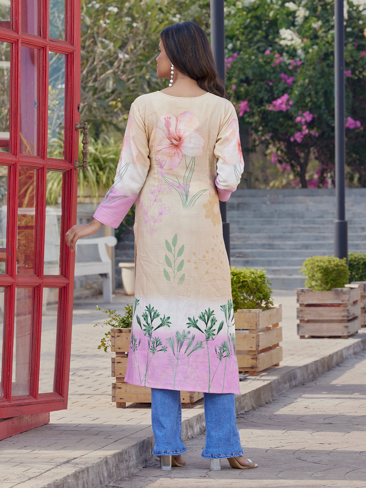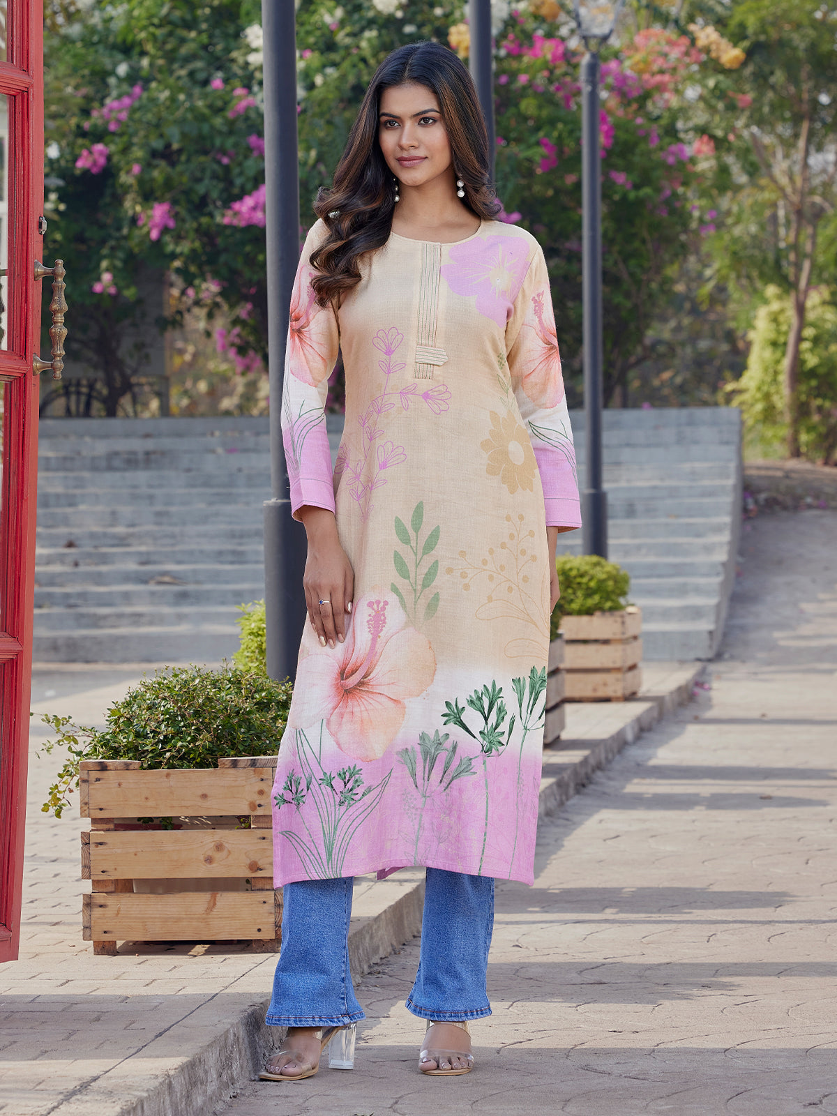 A gentle blend of blush and ivory flows through this pure cotton kurti, where soft floral prints bloom organically across the body, echoing a quiet garden story.