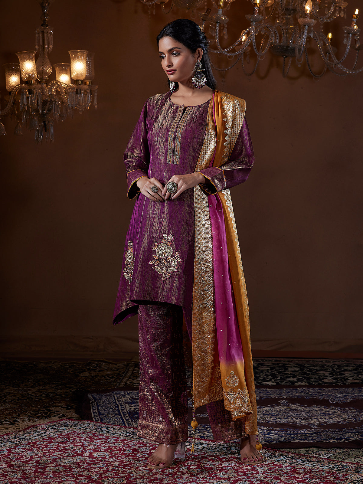 Rich in tone and texture, this plum zari jacquard suit set is a striking ode to refined Indian fashion. The kurta, woven in intricate self-design jacquard with a subtle chevron-inspired pattern, is beautifully accented with hand zardosi embroidery highlighting the neckline and blooming into statement motifs at the hem, creating a rich, artisanal finish. Coordinating wide-leg pants in shimmering zari jacquard lend depth with their textured weave and softly structured fall. The ombré dupatta in tones of gold melting into magenta is adorned with woven zari borders and delicate motifs, finished with elegant tassels for added charm. Designed for wedding soirées and celebratory evenings, this ensemble embodies contemporary ethnic wear with a regal, feminine presence.