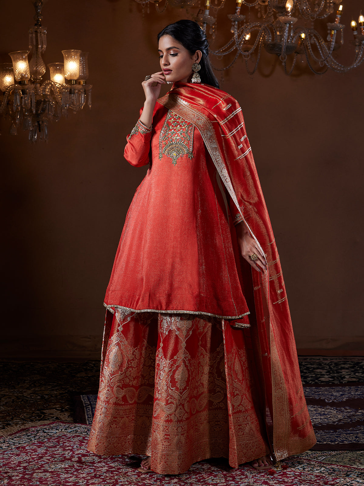 Draped in a rich red hue, this festive sharara set is designed for wedding celebrations that call for timeless grandeur. The flare kalidar kurta, crafted in luminous tissue silk, flows with graceful movement and is elevated by intricate zardosi embroidery adorning the yoke and sleeves. A delicate lace finish along the hem adds a refined touch, enhancing its artisanal appeal. Paired with a kalidar jacquard-woven sharara that lends depth and regal texture to the silhouette, the look is completed with a coordinating jacquard-woven dupatta, creating a composition that feels opulent, celebratory, and perfectly poised for cherished festive moments.