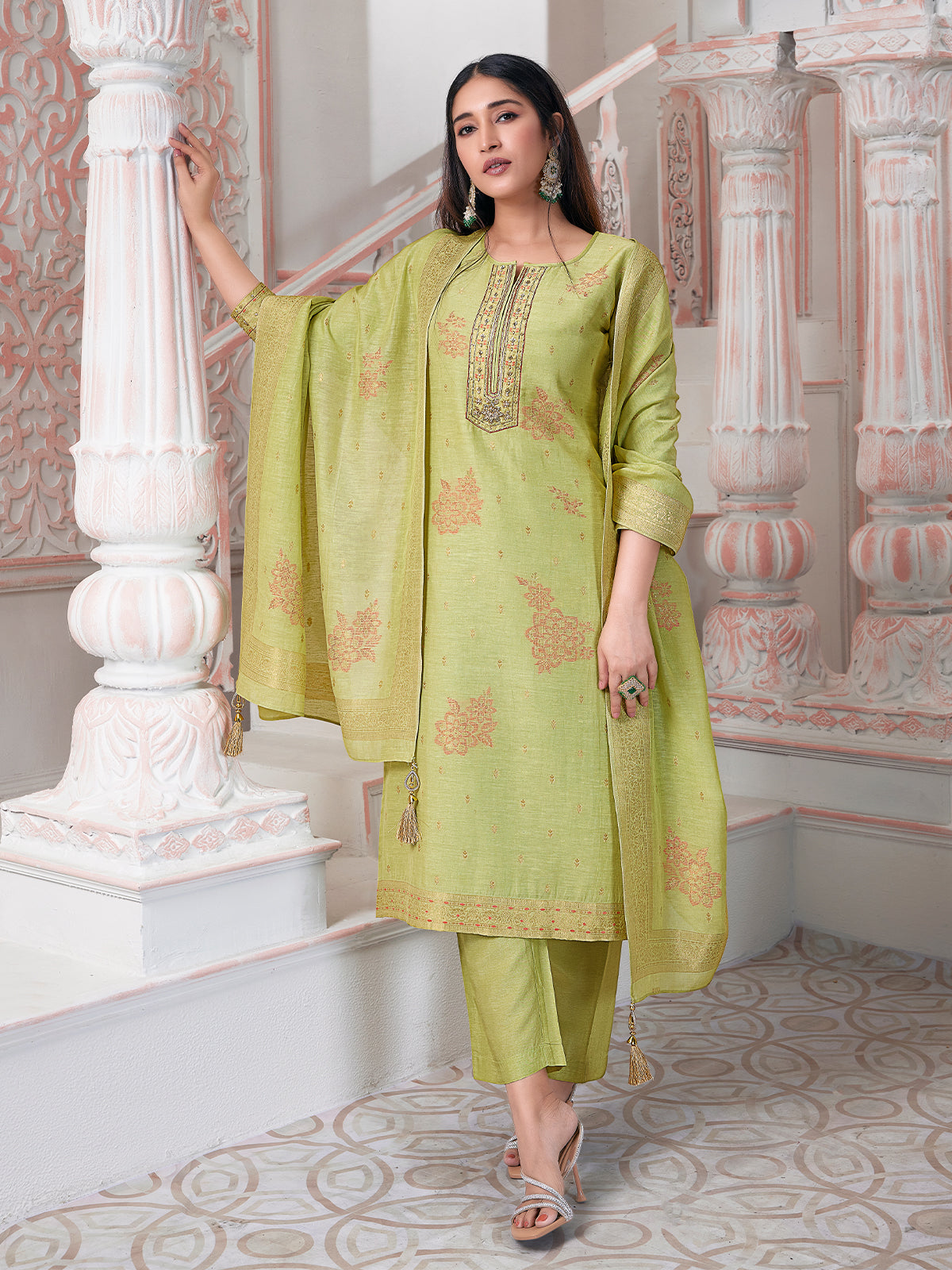 She steps into a celebratory brunch looking beautiful and elegant in this straight-fit kurta, woven jacquard with delicate floral motifs and a refined zardosi embroidered yoke. Paired with fluid mint green silk pants, the silhouette feels royal yet effortlessly comfortable. The co-ordinated jacquard woven dupatta drapes softly, adding grace and movement. Designed for the modern Indian woman, this festive ethnic wear blends timeless craftsmanship with feminine charm.