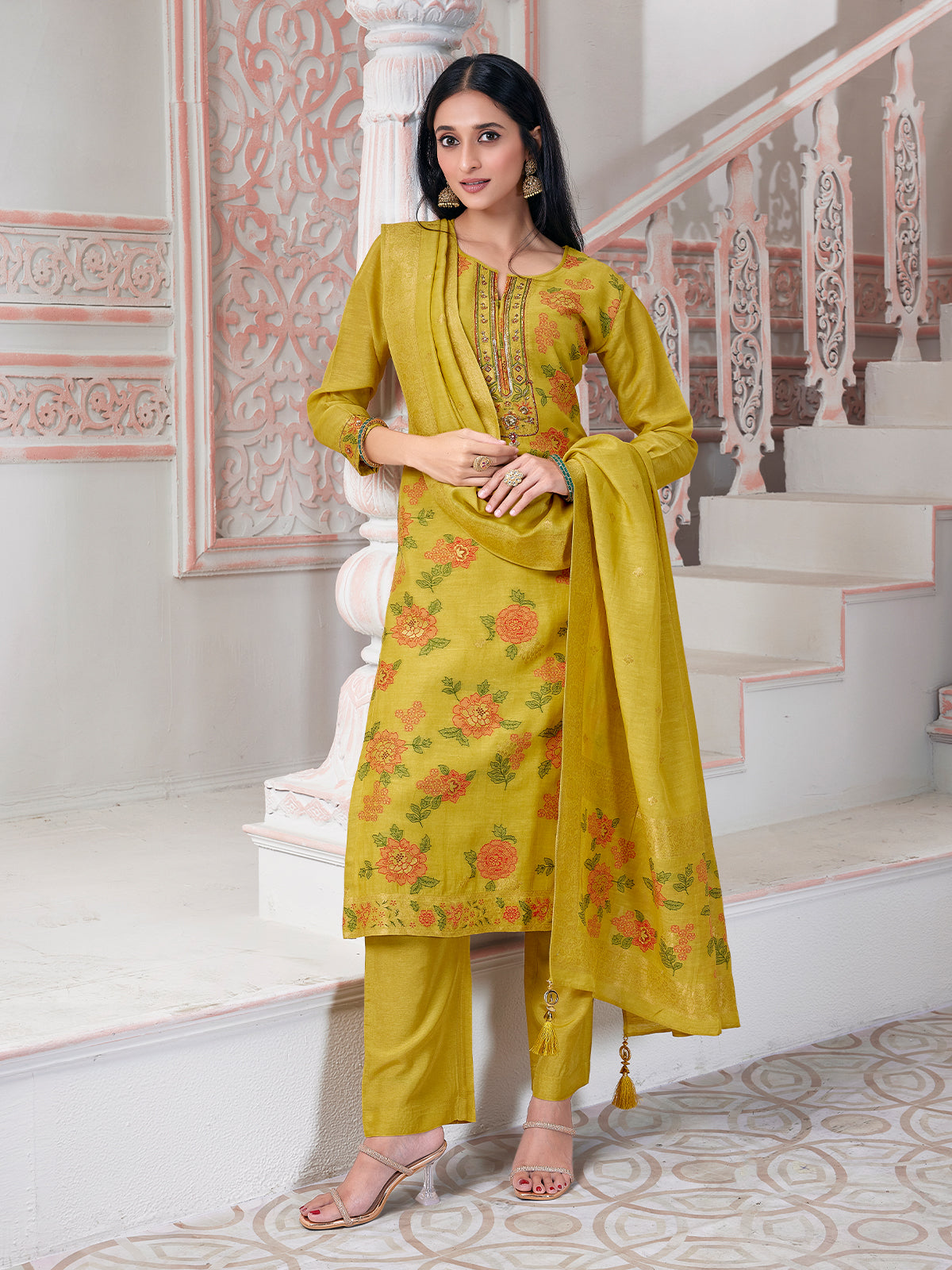 Sunlit laughter and haldi hues set the mood as she steps into the celebration in a radiant mustard suit set that feels joyful yet indulgent. The woven jacquard kurta, scattered with playful floral motifs and finished with delicate embellishment along the yoke, brings a festive charm rooted in effortless style. Paired with coordinated mustard yellow pants, the look stays easy and elegant, perfect for moments filled with movement and smiles. A lightly woven dupatta drapes with breezy grace, making this haldi-ready look a beautiful blend of fun, color, and luxurious celebration dressing.