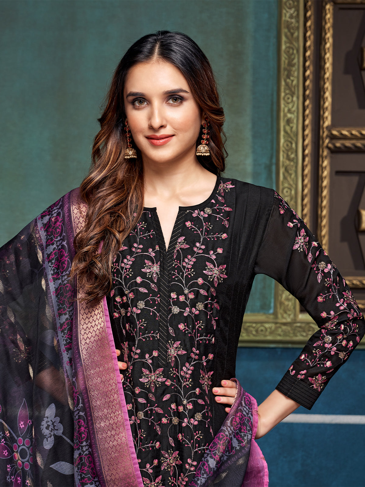 As dusk weaves its golden light, elegance takes centre stage in this black chanderi anarkali set — a vision of poise and allure. Crafted from lustrous chanderi fabric, the anarkali features a full, fluid flare that moves like poetry, while delicate floral embroidery and zari stitching details illuminate the centre panel and sleeves with refined artistry. Paired with black chanderi pants and a zari-woven dupatta adorned with floral prints and subtle sheen, the ensemble embodies regal sophistication — a celebration of tradition, craftsmanship, and modern grace that transforms every moment into a timeless memory.