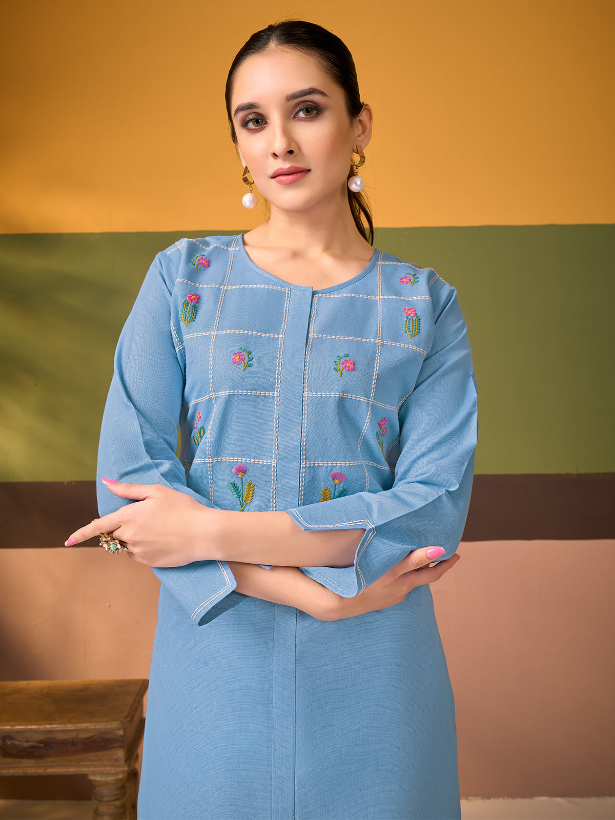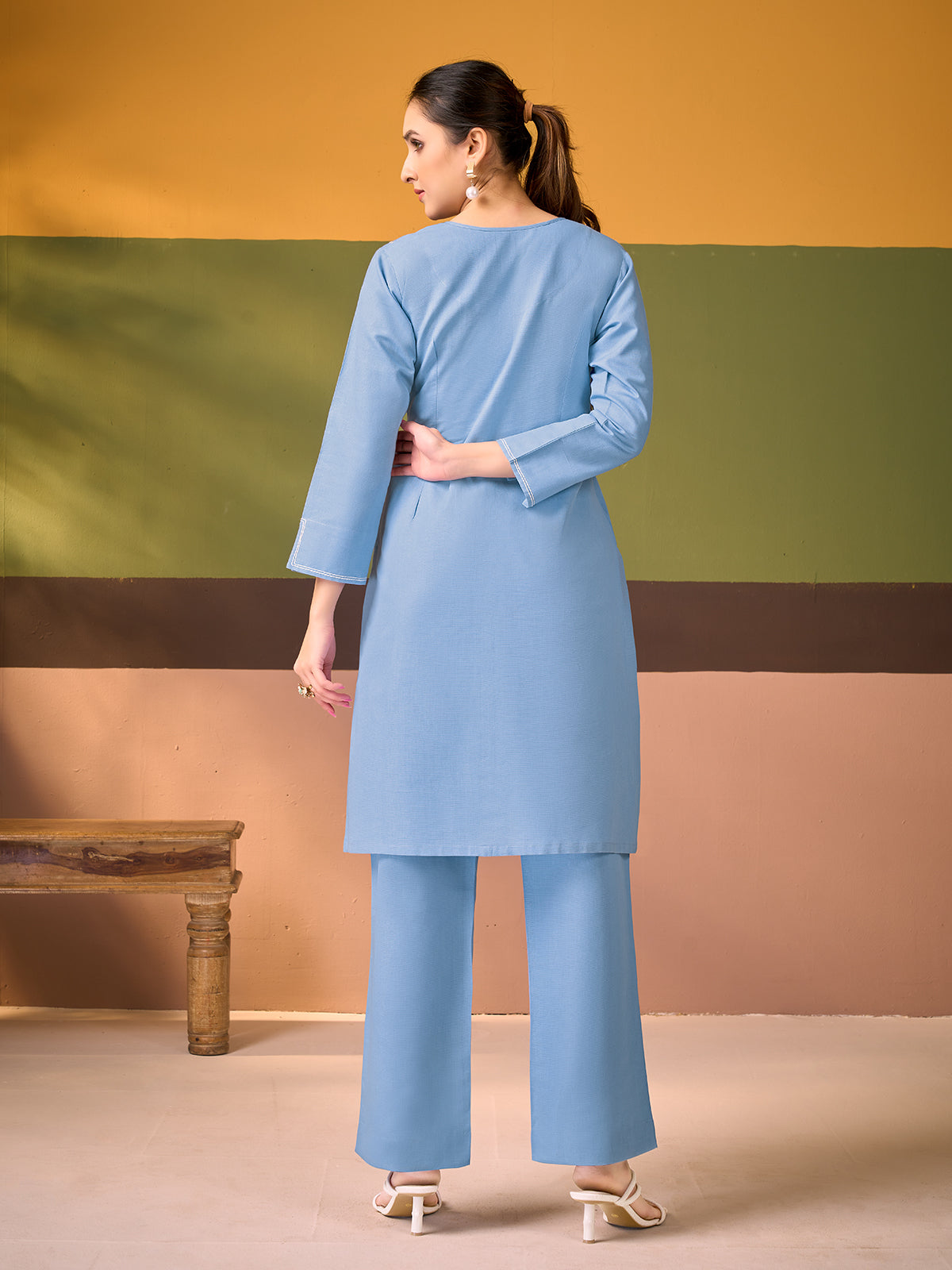 She moves through her day in the soothing charm of this powder blue cotton linen kurta set, a hue that feels fresh, airy, and effortlessly refined. The straight silhouette is elevated with a delicate grid of fine stitch lines across the yoke, each panel adorned with petite floral thread embroidery that adds a soft handcrafted appeal. Subtle stitch detailing frames the sleeves and neckline, enhancing its clean, structured finish. Paired with coordinated straight-fit pants in the same breathable cotton linen fabric, this elegant co-ord set brings together comfort, polish, and contemporary Indian wear sensibility for graceful everyday dressing.