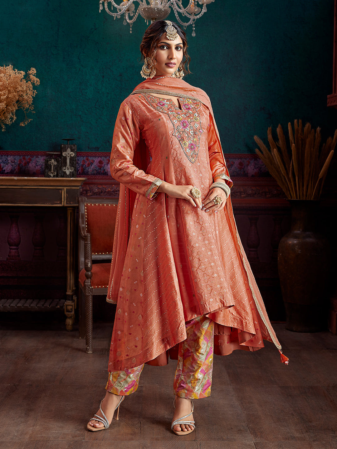 Orange Jacquard Anarkali Set