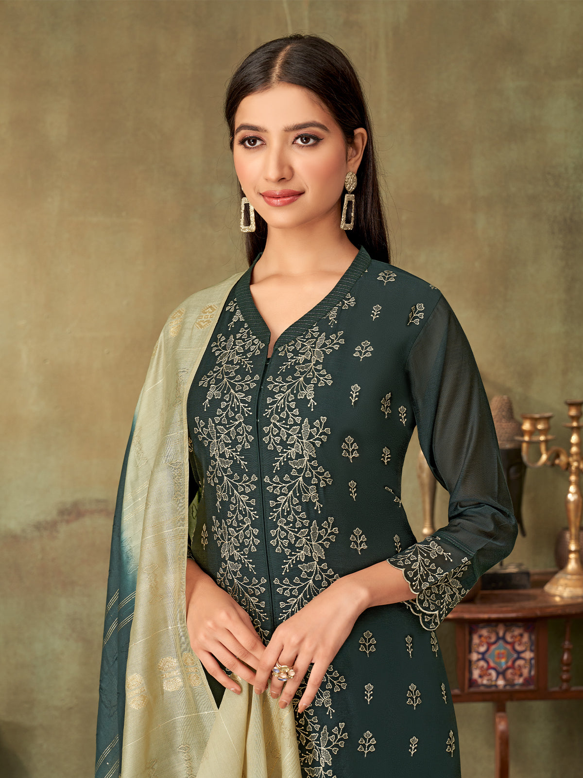 She arrived at the festive dinner draped in understated elegance — a grey Chanderi suit set that shimmered softly under warm evening lights. The straight-fit kurta, tailored in luxurious Chanderi fabric, flowed with quiet grace, its V-neck collar detailed with refined stitching and delicate beige thread embroidery. The coordinated Chanderi pants lent a polished charm, balancing the ensemble’s traditional spirit. Completing the look, a zari-woven shaded dupatta glimmered with festive radiance, wrapping her in a mood of celebration and effortless poise.