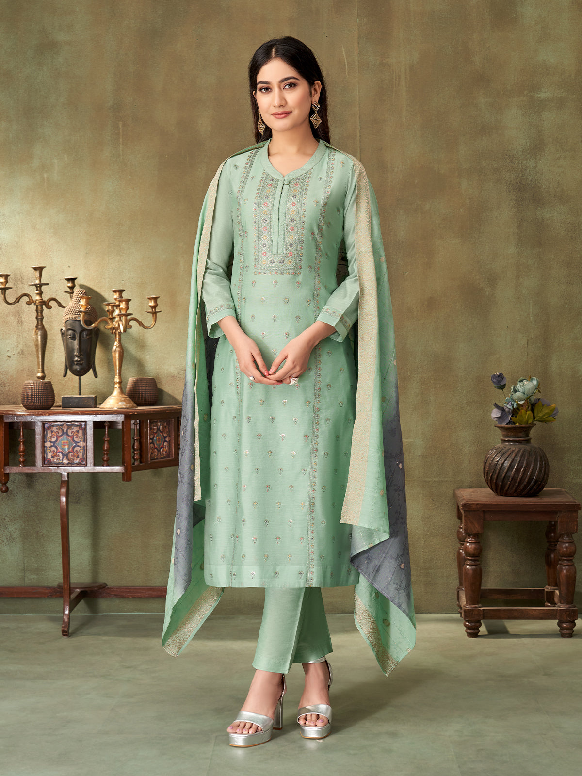 Bathed in soft daylight, she radiates refined charm in a beige semi-silk suit set that captures the essence of festive grace. The straight-fit kurta, tailored with a sleek flat collar, features a vibrant floral embroidered centre panel and scattered motifs that add artisanal allure. Paired with zari-bordered pants and a floral placement print dupatta that glimmers gently, her look is a vision of modern Indian elegance — serene, sophisticated, and effortlessly beautiful.