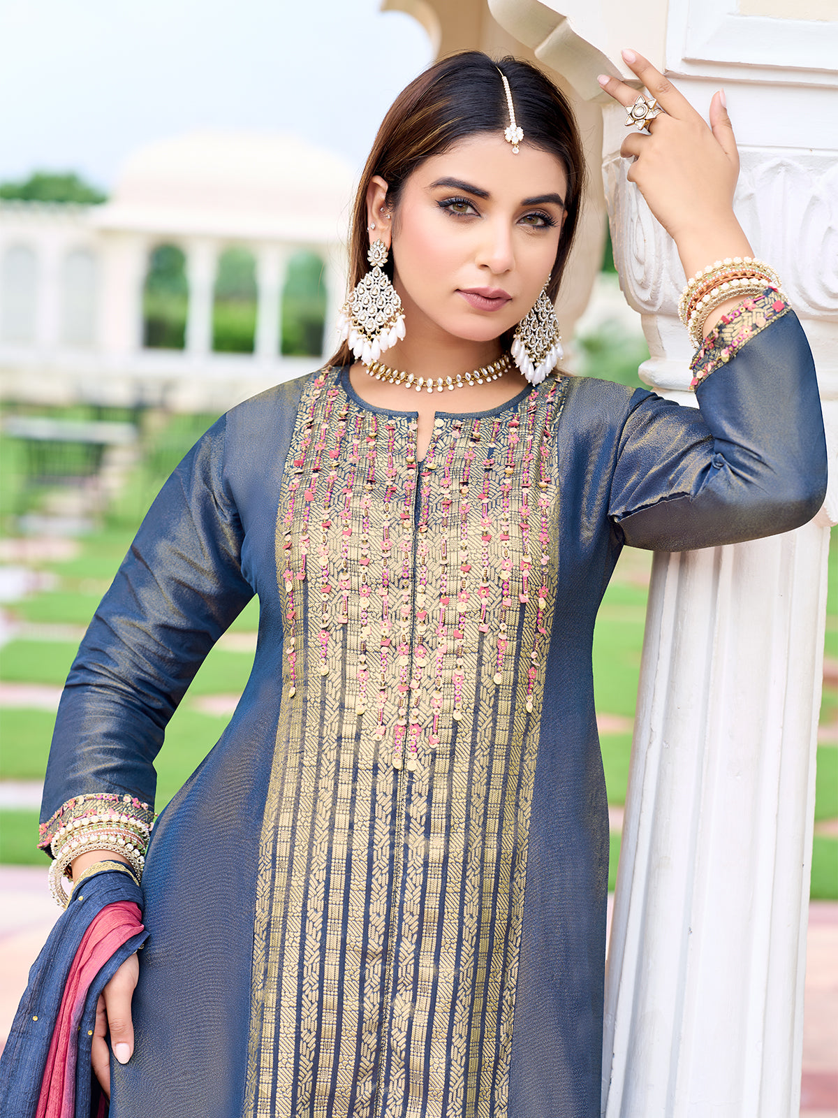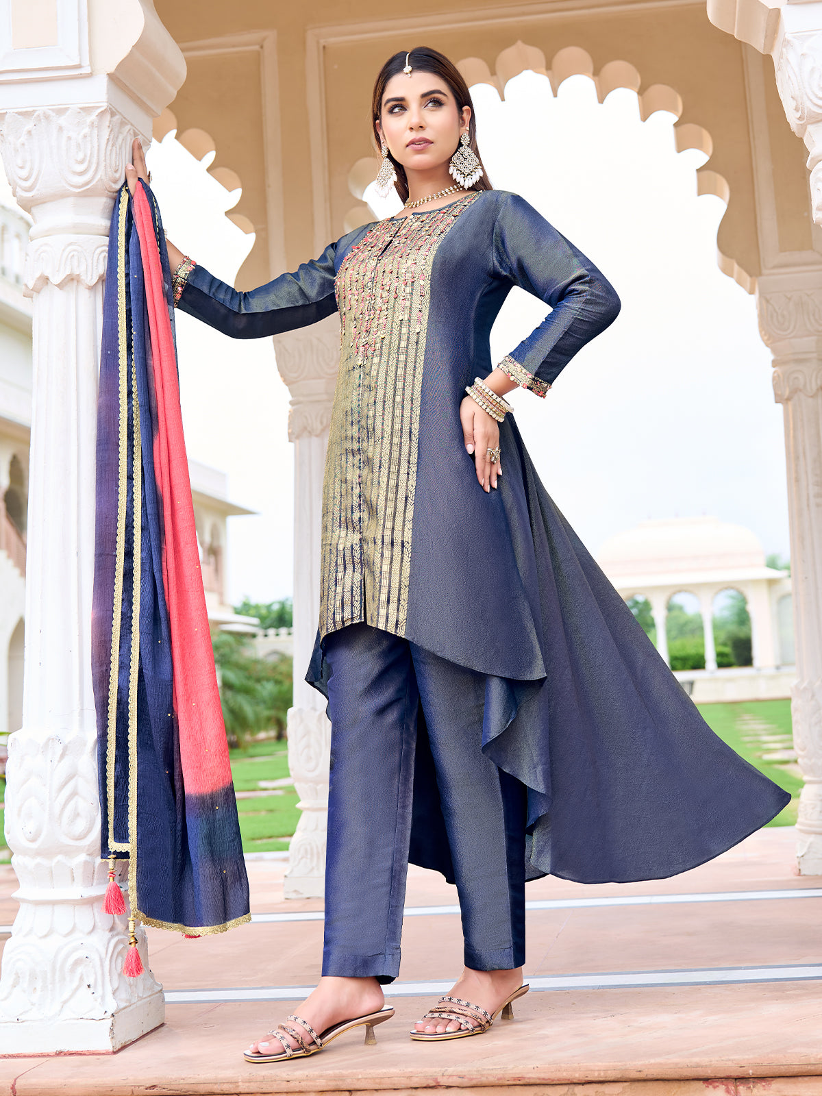 She steps into the sunlit courtyard wrapped in a deep navy blue kurta set, her presence poised and quietly striking. The layered kurta, adorned with intricate metallic embroidery along the front, catches the light with a refined, festive shimmer. Paired with sleek matching pants and finished with a dual-toned navy and coral dupatta, the look flows with effortless elegance. Graceful yet contemporary, she carries tradition with ease. A timeless expression of Indian wear, where craftsmanship, colour, and modern silhouettes come together.