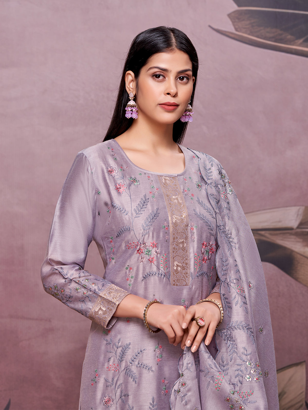 In the serenity of lavender, she finds her festive spirit. The semi-silk kurta, straight in silhouette and adorned with intricate floral embroidery, glimmers softly with zari borders at the neckline and sleeves. Worn with zari-trimmed pants and an embroidered dupatta, her ensemble reflects the beauty of traditional Indian wear — elegant, regal, and effortlessly graceful.