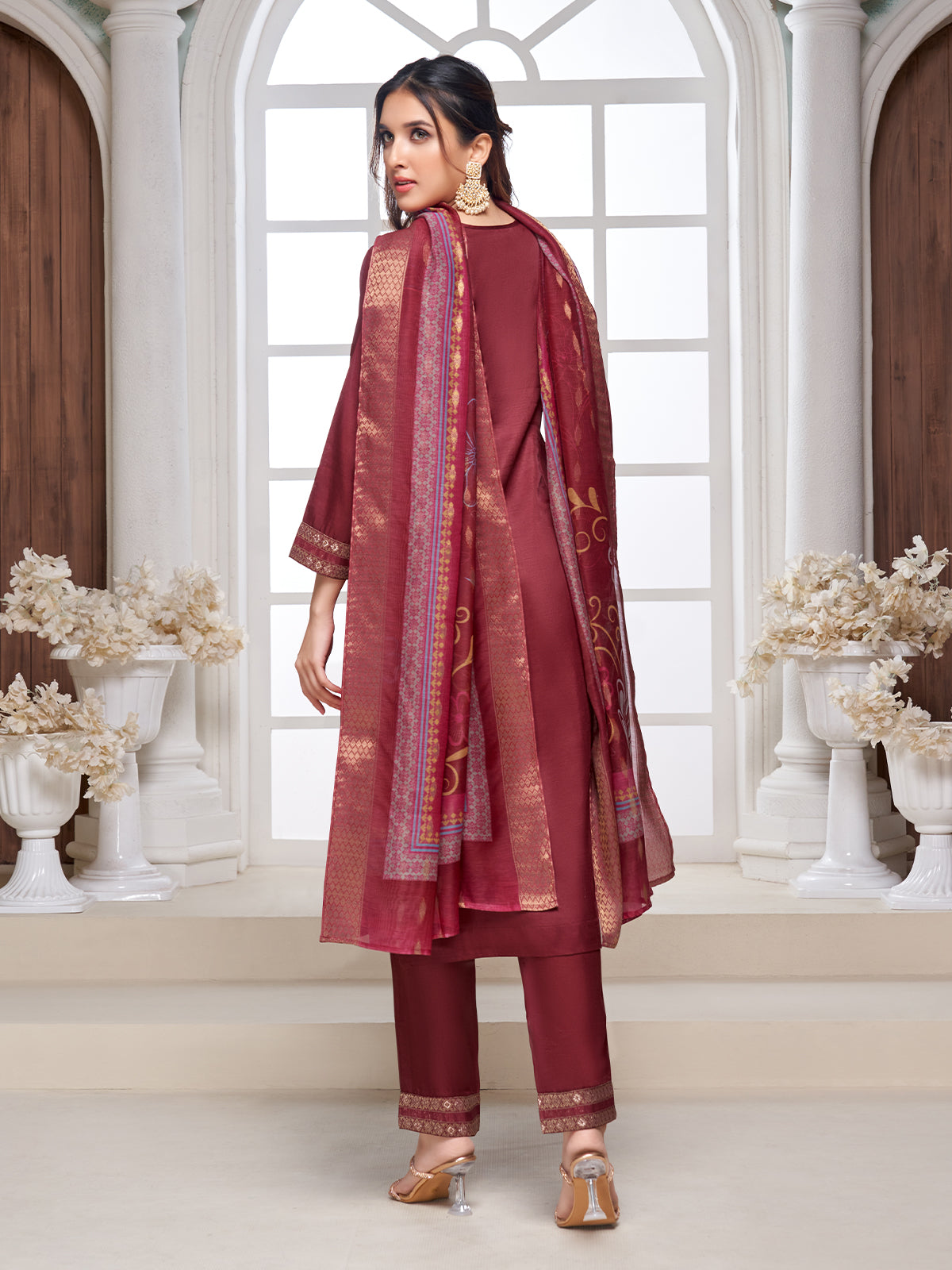 Set for an elegant festive evening, she steps in wearing a rich maroon semi silk suit set that feels celebratory yet refined. The straight-fit kurta is adorned with delicate floral motifs scattered across the surface, framed by a subtle zari border that adds a touch of festive shimmer, while the sleeves echo the detailing for a cohesive finish. Coordinated pants are finished with a matching zari border at the hem, grounding the look in quiet luxury. Draped with a softly printed dupatta that moves effortlessly, the ensemble is designed for evenings filled with celebration and timeless style.