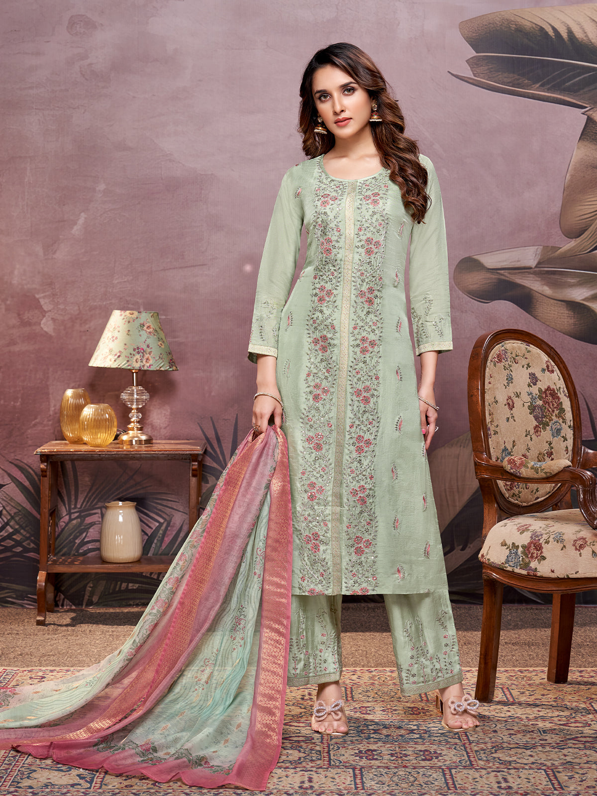 As laughter fills the air, she embodies elegance in a muted green semi-silk suit set crafted to perfection. The straight-fit kurta, adorned with fine floral embroidery panels and tonal thread motifs, reflects exquisite craftsmanship. Complemented by sleek semi-silk pants with floral embroidery and a zari-woven dupatta with delicate floral print that shimmers with festive warmth, her Indian wear look is both beautiful and sophisticated.