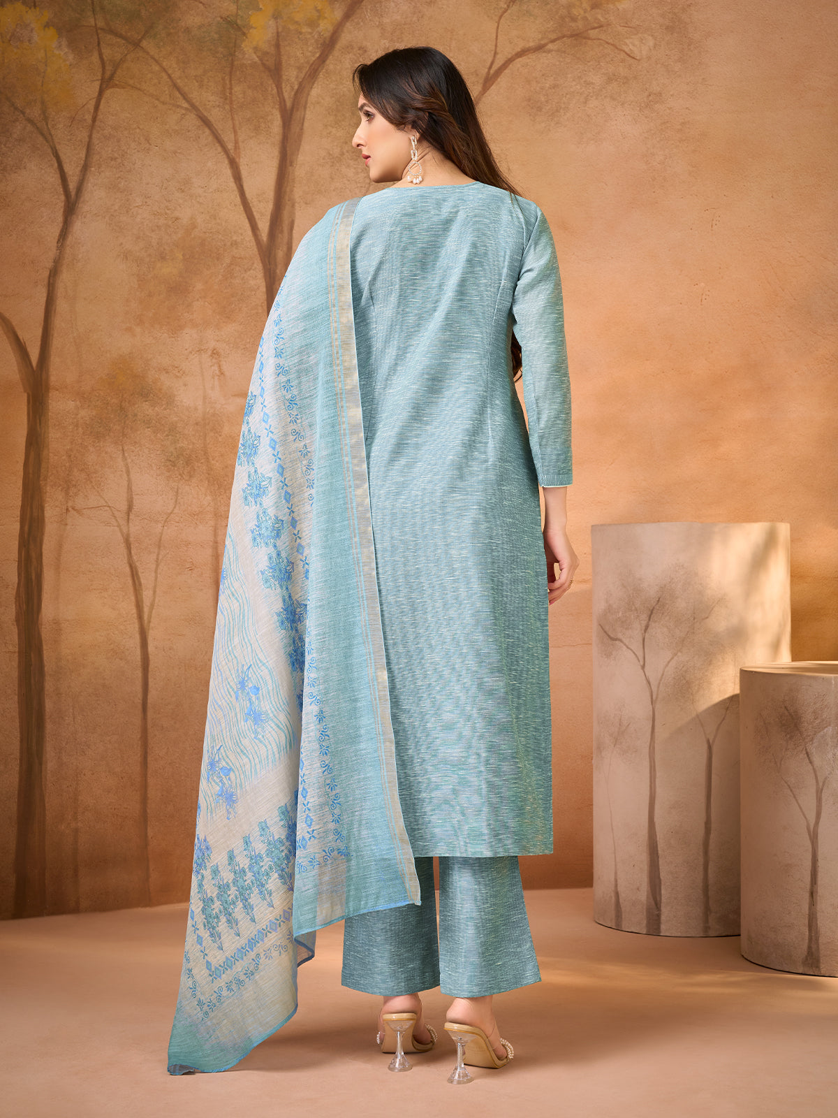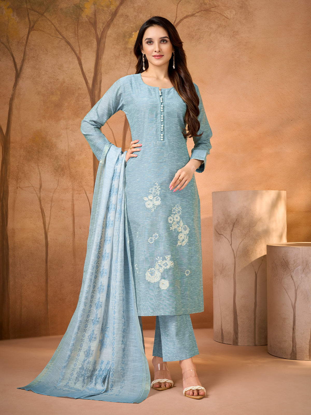 A vision of calm sophistication, the modern woman steps into her day adorned in this powder blue suit set crafted for effortless everyday wear. The straight-fit kurta in textured fabric is elevated with delicate white floral thread embroidery scattered gracefully across the front, while the soft round neckline with fabric button detailing adds refined charm. Coordinated straight pants complete the silhouette with understated polish. The printed dupatta, adorned with intricate motifs and subtle borders, drapes fluidly over her shoulder, bringing movement and feminine elegance to this simple yet beautiful ethnic ensemble — perfect for office hours and daytime gatherings.