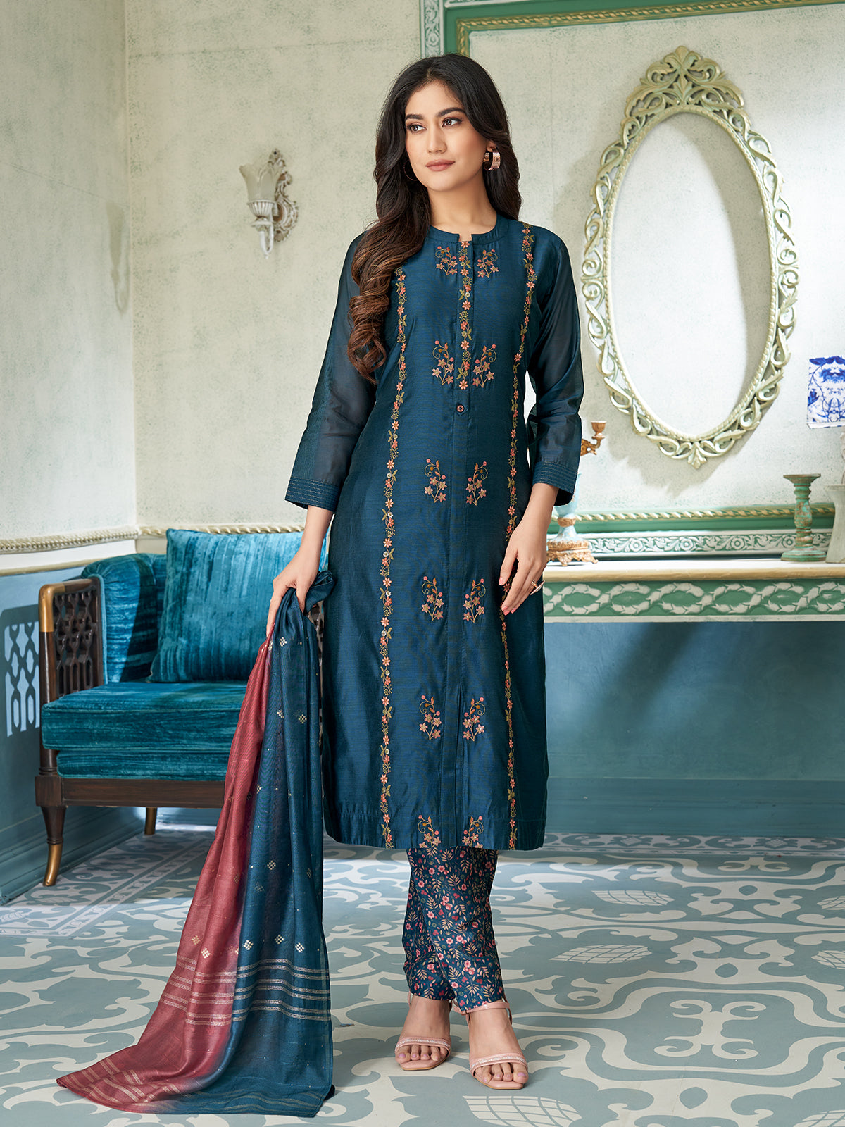 As the evening unfolds in soft candlelight, she steps into the festive dinner with a quiet, confident grace. Her blue chanderi suit set glimmers subtly, adorned with delicate thread embroidery that trails along the front panel and sleeves, creating an elegant rhythm of craftsmanship. The straight-fit silhouette pairs beautifully with floral-printed pants, blending classic artistry with modern charm. Draped in a dual-toned zari-woven dupatta, she carries an aura of effortless sophistication — a perfect reflection of festive elegance woven into timeless Indian wear.