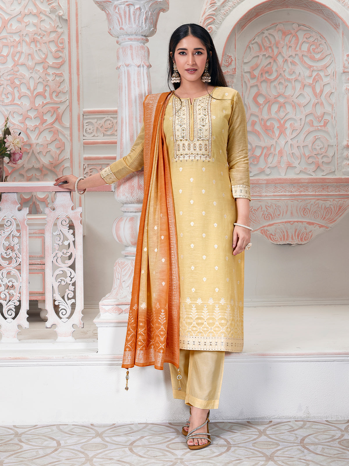 Wrapped in a soft glow of celebration, she steps into the gathering in a sun-kissed yellow kurta, its finely woven fabric lending a serene yet sophisticated presence. The straight silhouette, adorned with intricate embroidery along the yoke, adds a touch of artisanal richness that feels quietly luxurious. Paired with fluid, tonal pants, the look moves with effortless grace, balancing comfort and refined fashion sensibility. An ombre-hued woven dupatta, finished with delicate tassels, drapes elegantly, bringing warmth, femininity, and timeless festive style to this beautifully poised ensemble.