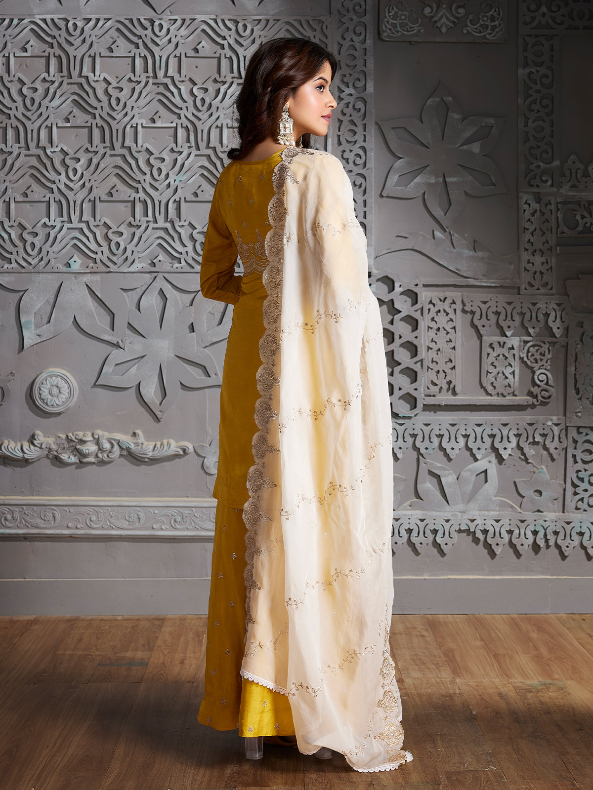 In the golden warmth of her haldi celebration, a vibrant yellow semi silk sharara set becomes her expression of joyful, festive elegance. The short, straight-fit kurta glows in luminous yellow semi silk, adorned with handcrafted zari embroidery that gracefully traces the neckline, full sleeves, and hem, while delicate motifs shimmer subtly across the refined fabric. Each detail beautifully blends traditional Indian craftsmanship with modern ethnic style. The flowy yellow semi silk sharara, dotted with intricate zari butti, sways with every step, while the ivory semi silk dupatta—accented with an ornate zari border, delicate white lace and soft tassels—rests lightly, completing her elegant and festive look..